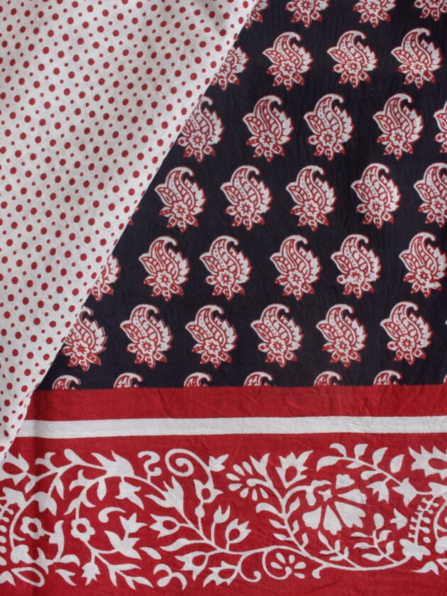 Black, red and off-white Hand-Block Printed, prewashed, Pure mulmul, soft-cotton Saree with matching blouse fabric.