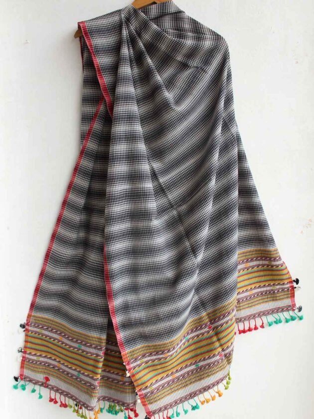 Black and white traditional chequered pattern Handwoven, Kutch kala cotton dupatta. Red side borders and Red, green, yellow and white bottom borders and tassels.