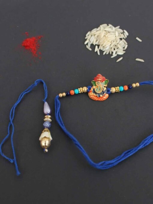 Material: multicoulour beads and metallic Ganesha , Blue cotton thread for string Rakhi