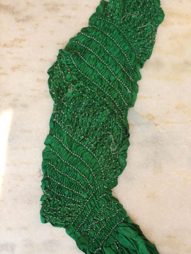 The product is crinkled state and needs to be ironed to attain full length and width, though these knots too add to its charm
