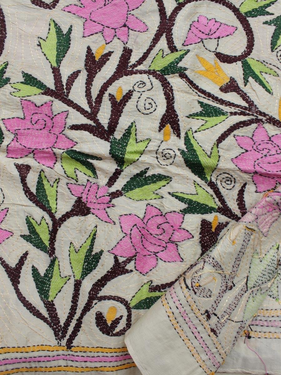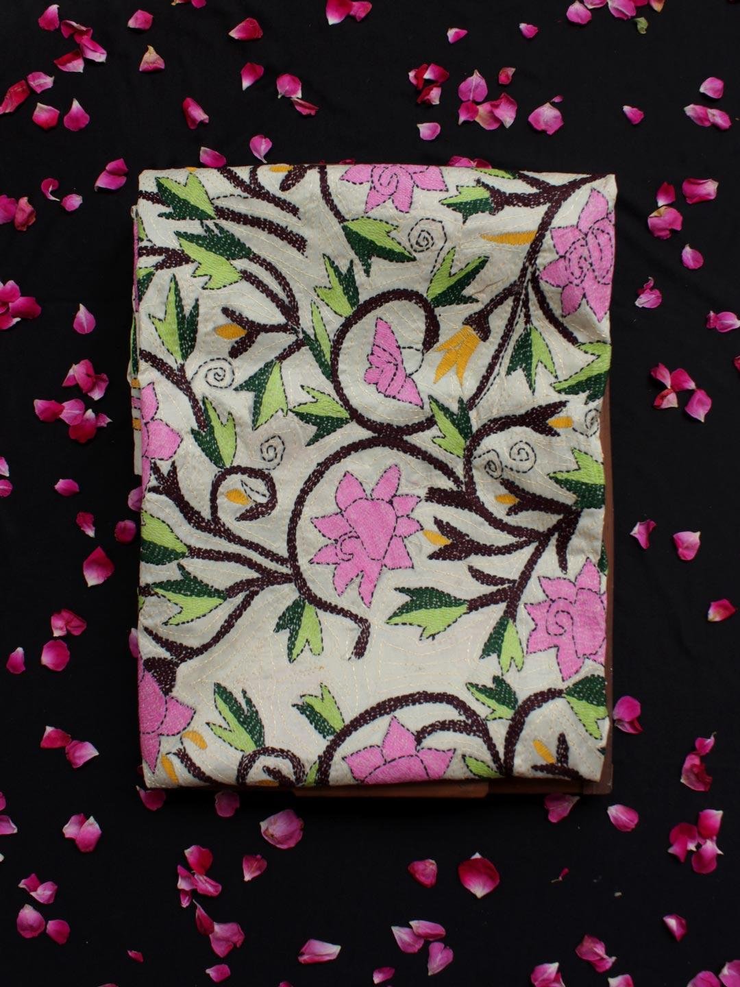 Purple-Pink Roses, Green leaves and brown twigs Nakshi Kantha – নকশি কাঁথা handembroidered off-white semi-tussar silk dupatta.