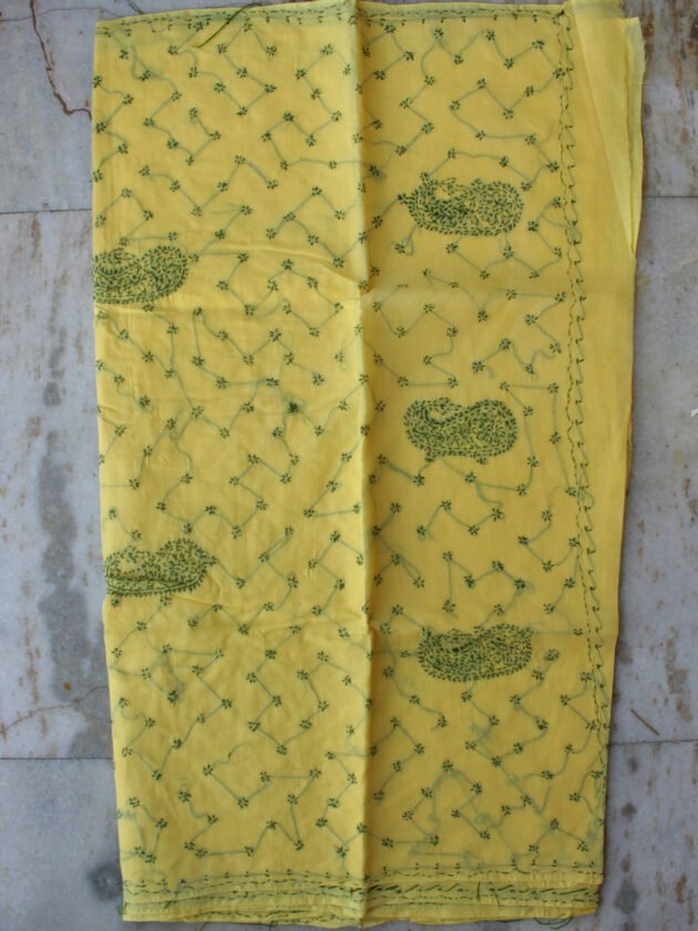 Green Lucknow chikankari Hand-Embroidery on Yellow cotton Saree