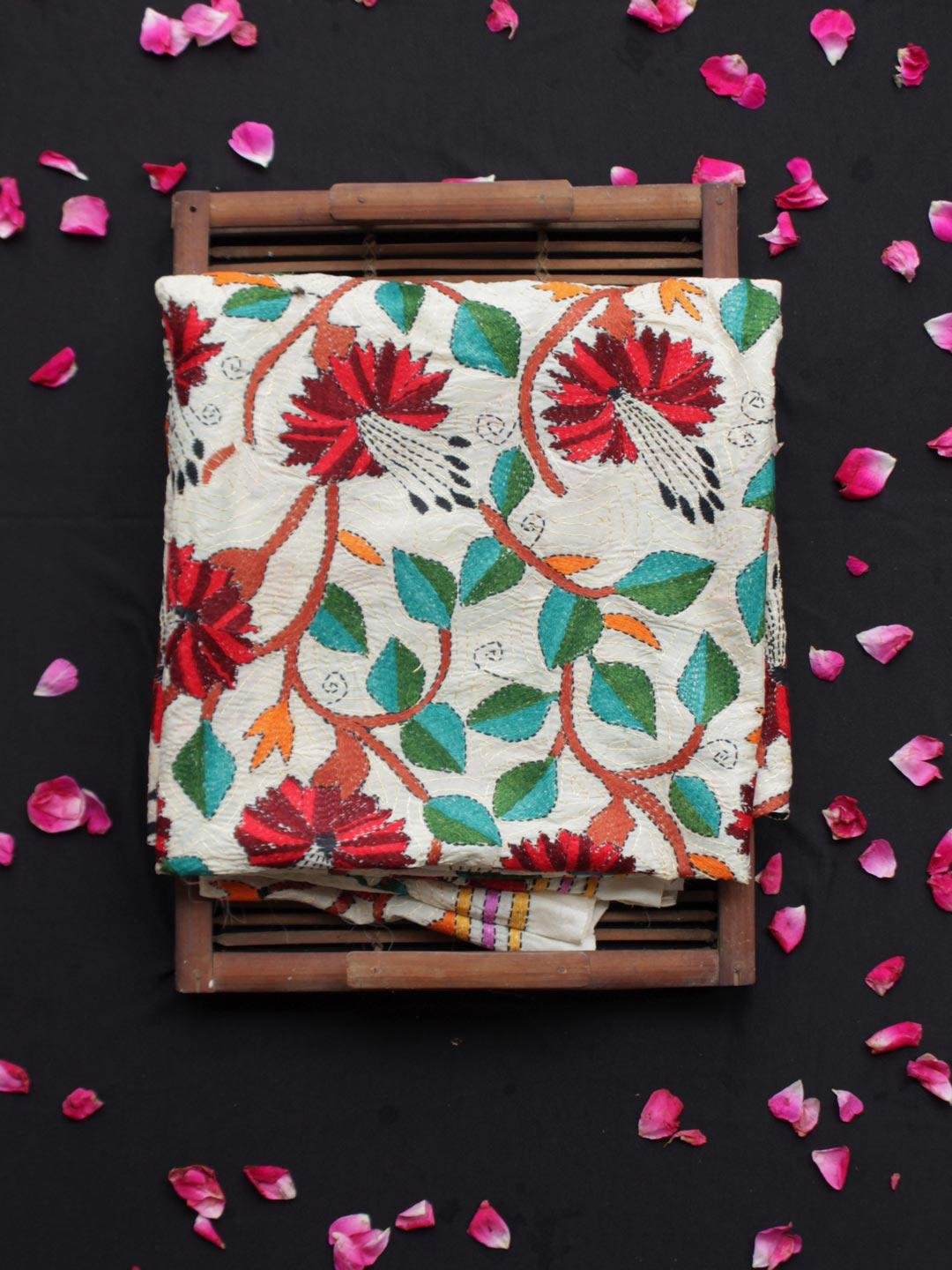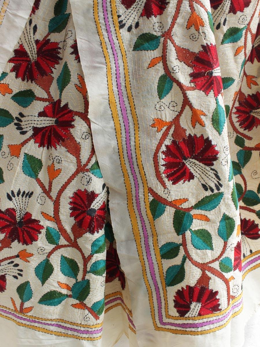 Dark-Red and Black-Red flowers Nakshi Kantha – নকশি কাঁথা handembroidered Cream-white semi-tussar silk dupatta.