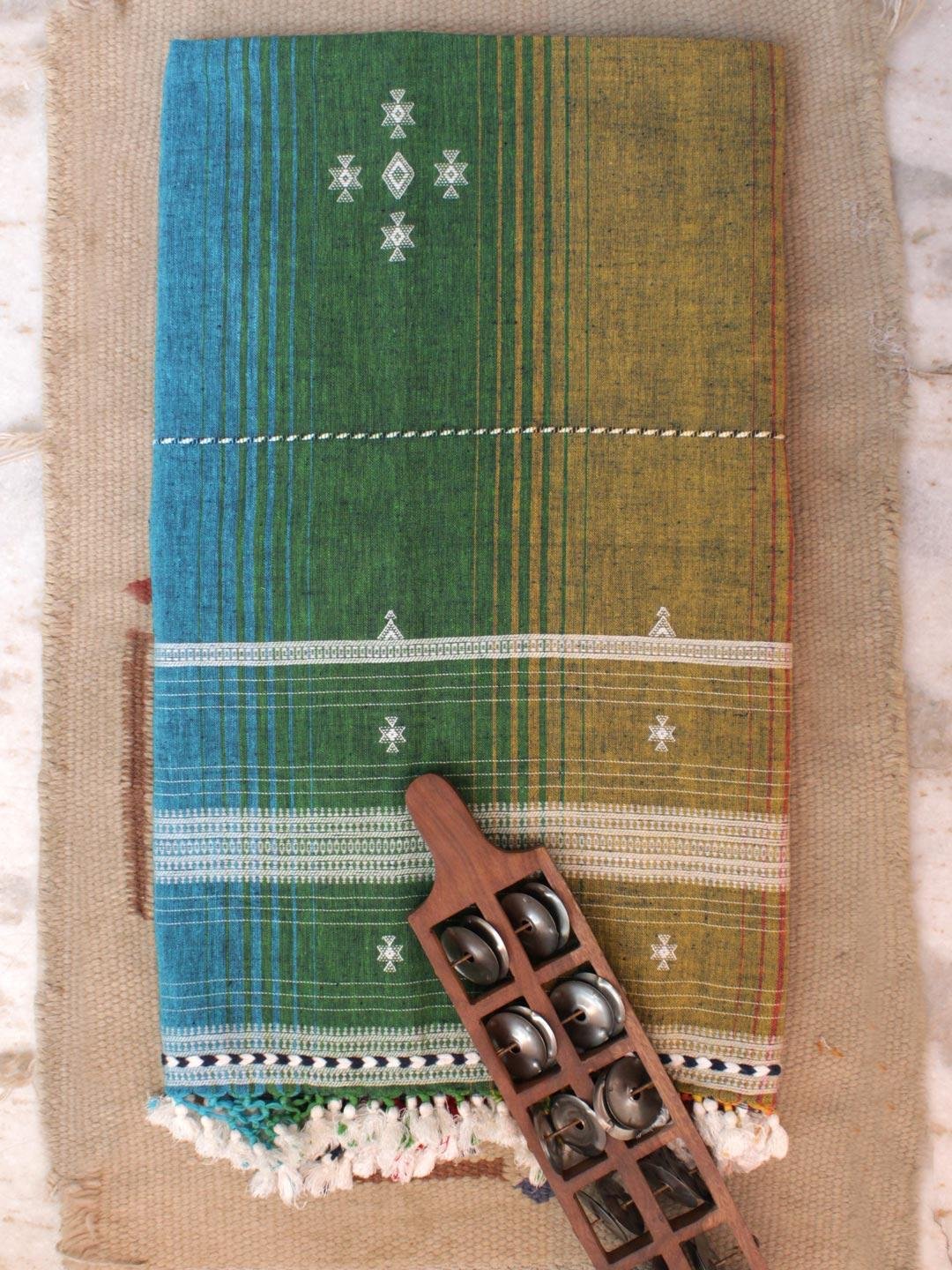 Hand-woven, Multicolor-striped dupatta with extra-weft-motifs, miri-border and artistic tassels