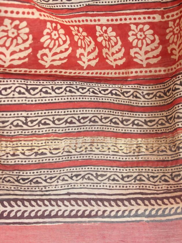 Black and Madder-red block-print on Beige-white chanderi silk-cotton Kurta-dupatta set with cotton bottom fabric.