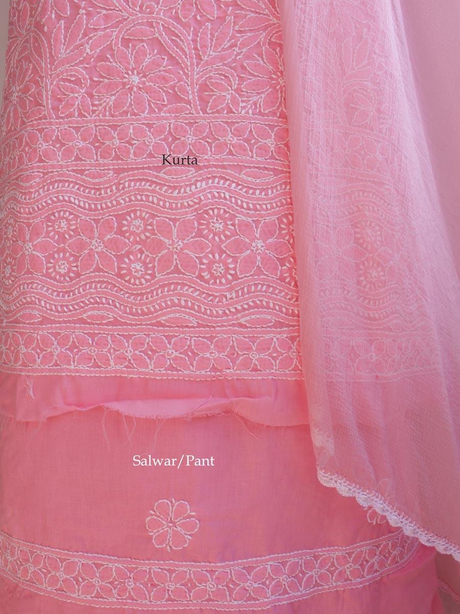 Kurta/top- White Cotton With overall embroideredy on front small butis at back: Length- 3 meters Width- 1.10 mt