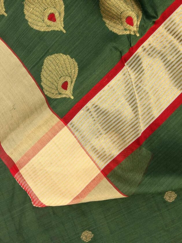 Lightweight, semi-transparent, Green Handloom woven pure silk-cotton chanderi saree with red and golden zari-work. Saree has mor(peacock) buti at Palla and small butis allover. Plain blouse with zari border