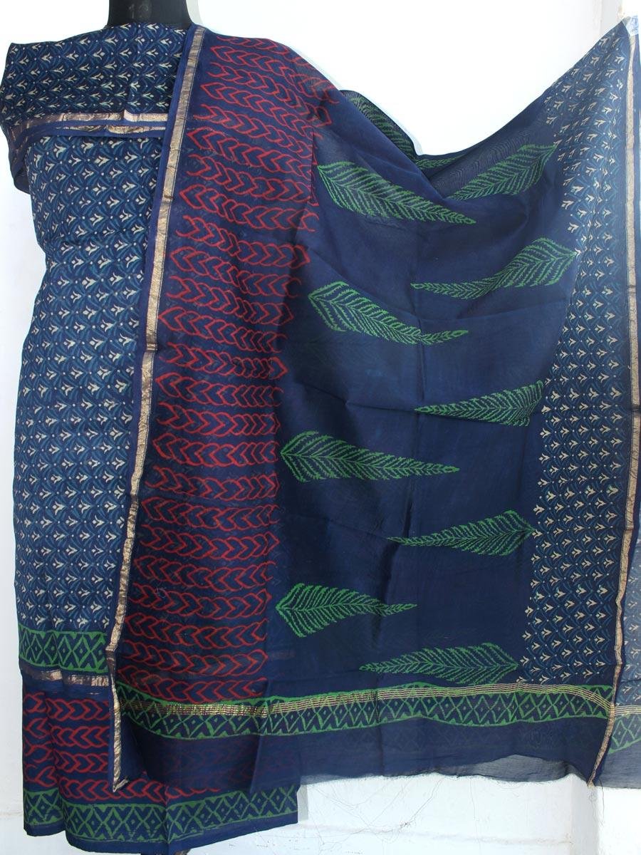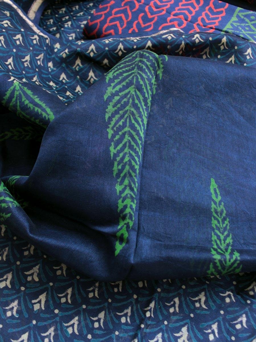 Red, green and white block-print on indigo-Blue chanderi silk-cotton Kurta-dupatta set with cotton bottom fabric.