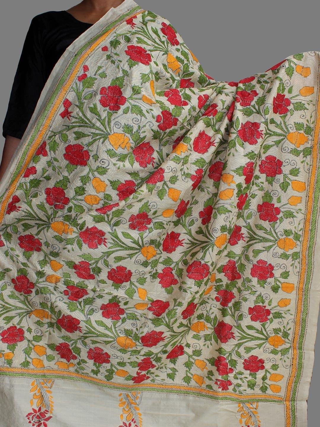 Red roses, kantha Embroidered Tassar Silk Dupatta