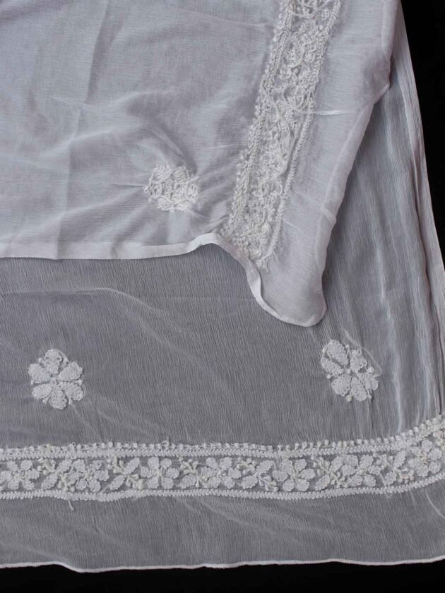 White soft-chiffon Duppata, handembroidered with threadwork from Lucknow. Dyeable