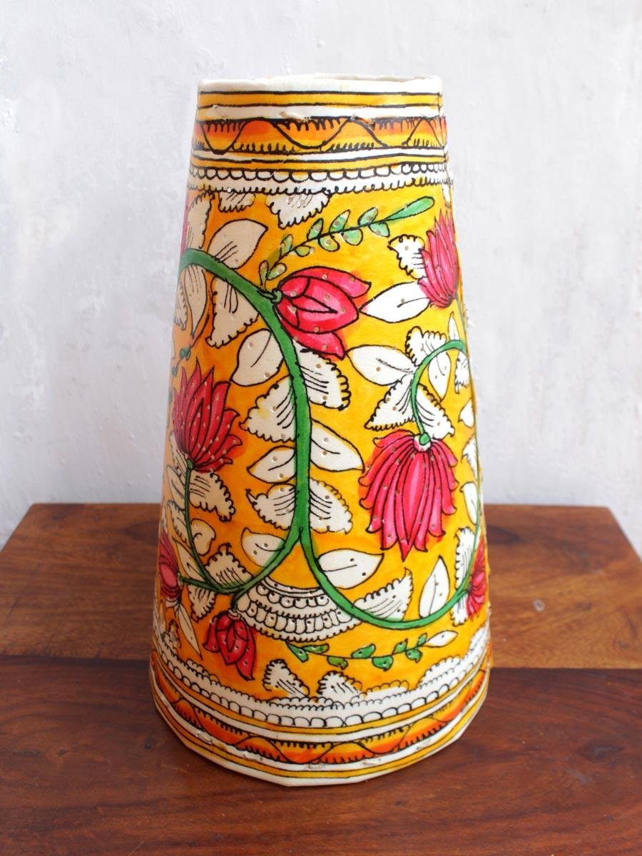 Handmade, Conical, medium size, 12inches, ceiling Handmade, Conical, medium size, 12inches, ceiling lamp/ pendant-lamp, handpainted with flowers and leaves based on leather puppetry art from Andhra Pradesh and Telangna..
